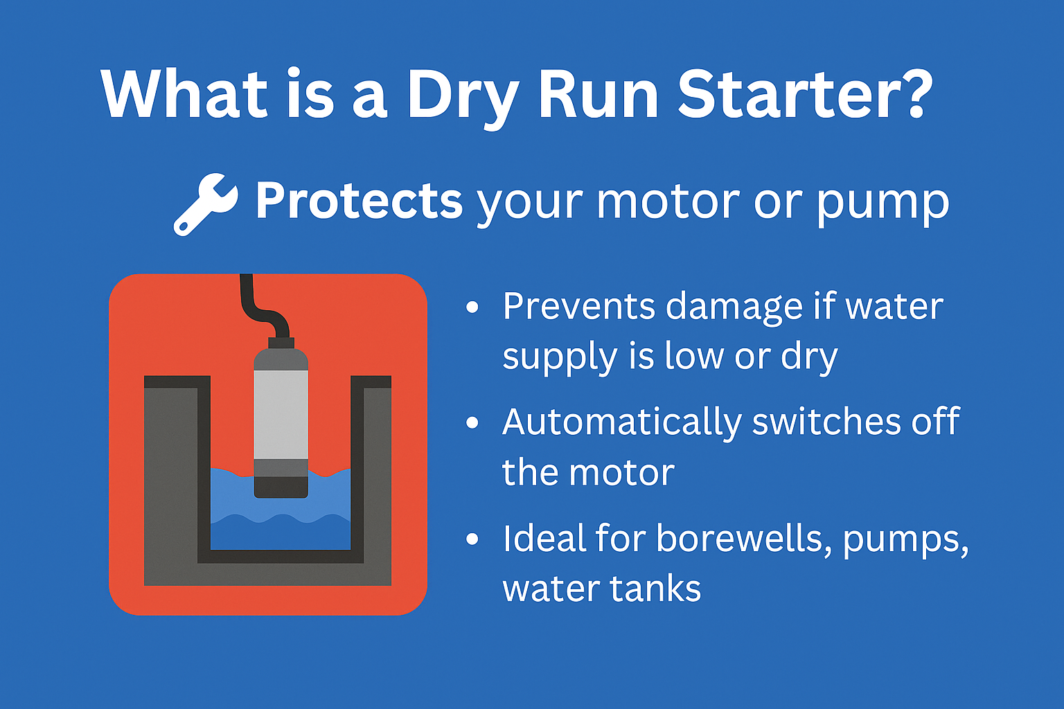 A Dry Run Starter is an electronic device designed to protect your motor or pump from running without water ā a condition known as a dry run.